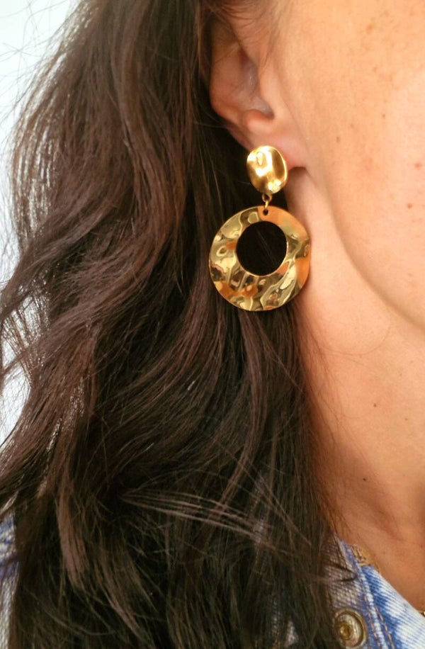 Boucles d'oreilles pendantes et légères. Le côté oversize apport une touche de caractère et d’élégance. La finition dorée illumine le visage et s’associe parfaitement à d'autres bijoux ou tenues estivales comme hivernales.