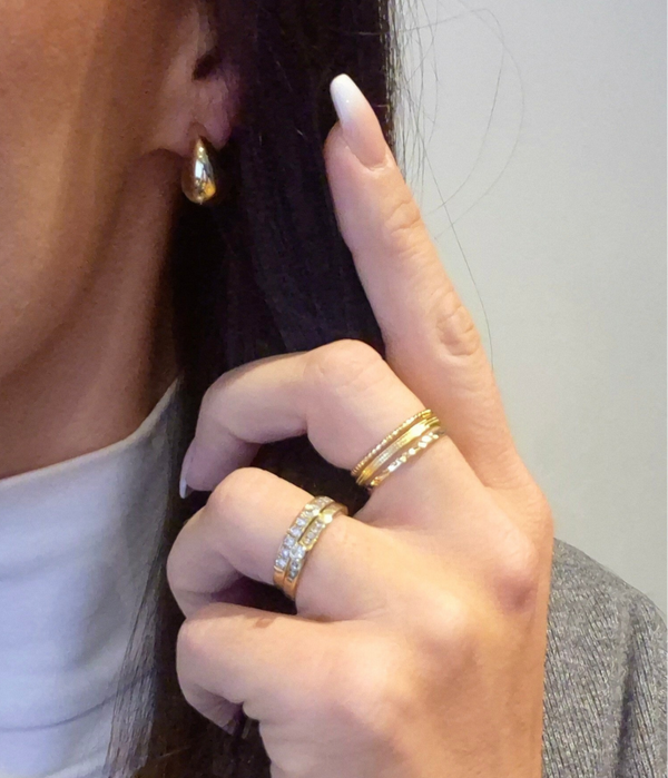 Cette bague est composée de trois anneaux aux effets différents (martelé, quadrillé et perlé).